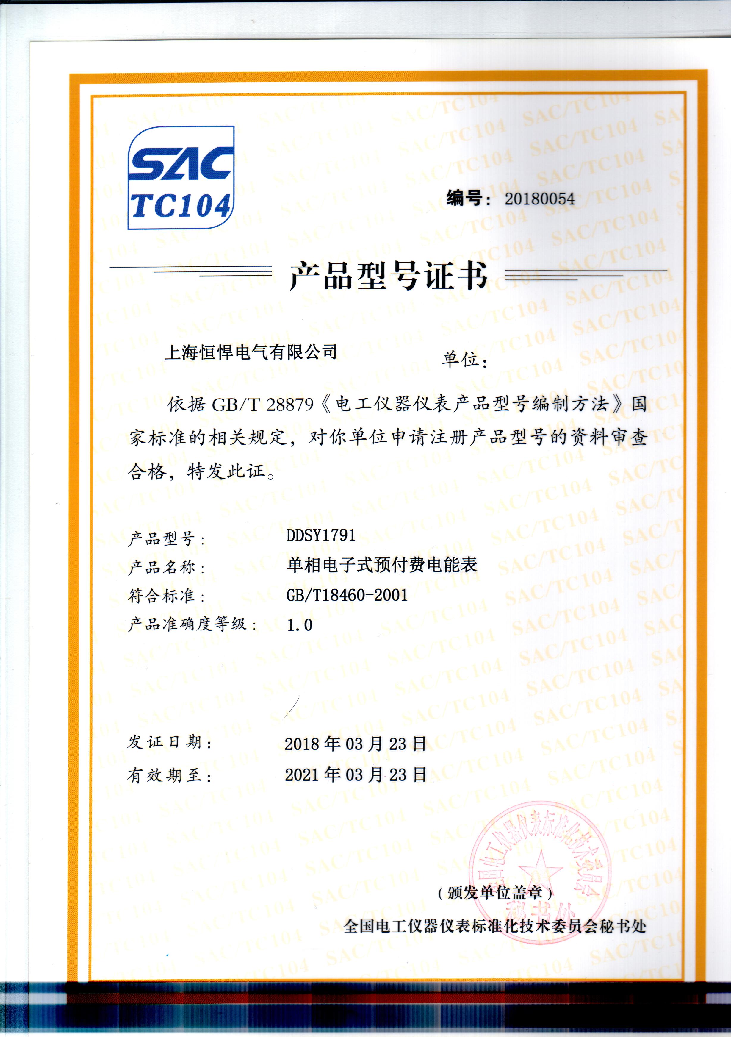• 恒悍單相預付費電表型號證...